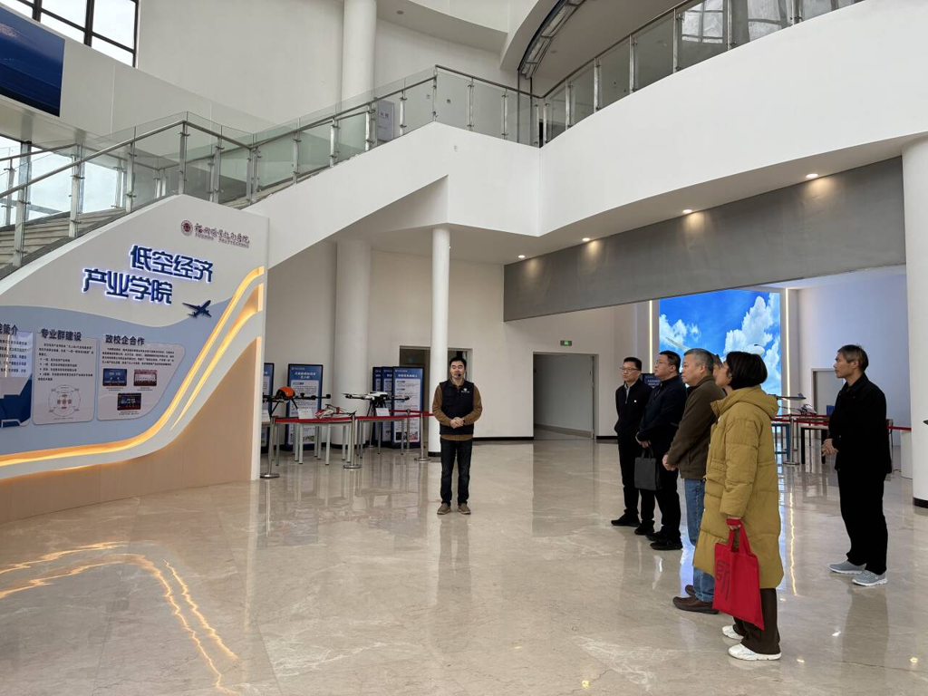在福州职业技术学院党委书记王建生、副院长饶绪黎等相关领导的陪同下,我院团队实地考察了该校低空经济产业学院实训基地。现场观摩期间,双方就实训基地建设、核心课程设计、实训项目开发与产业需求对接等关键问题进行了深入互动交流。